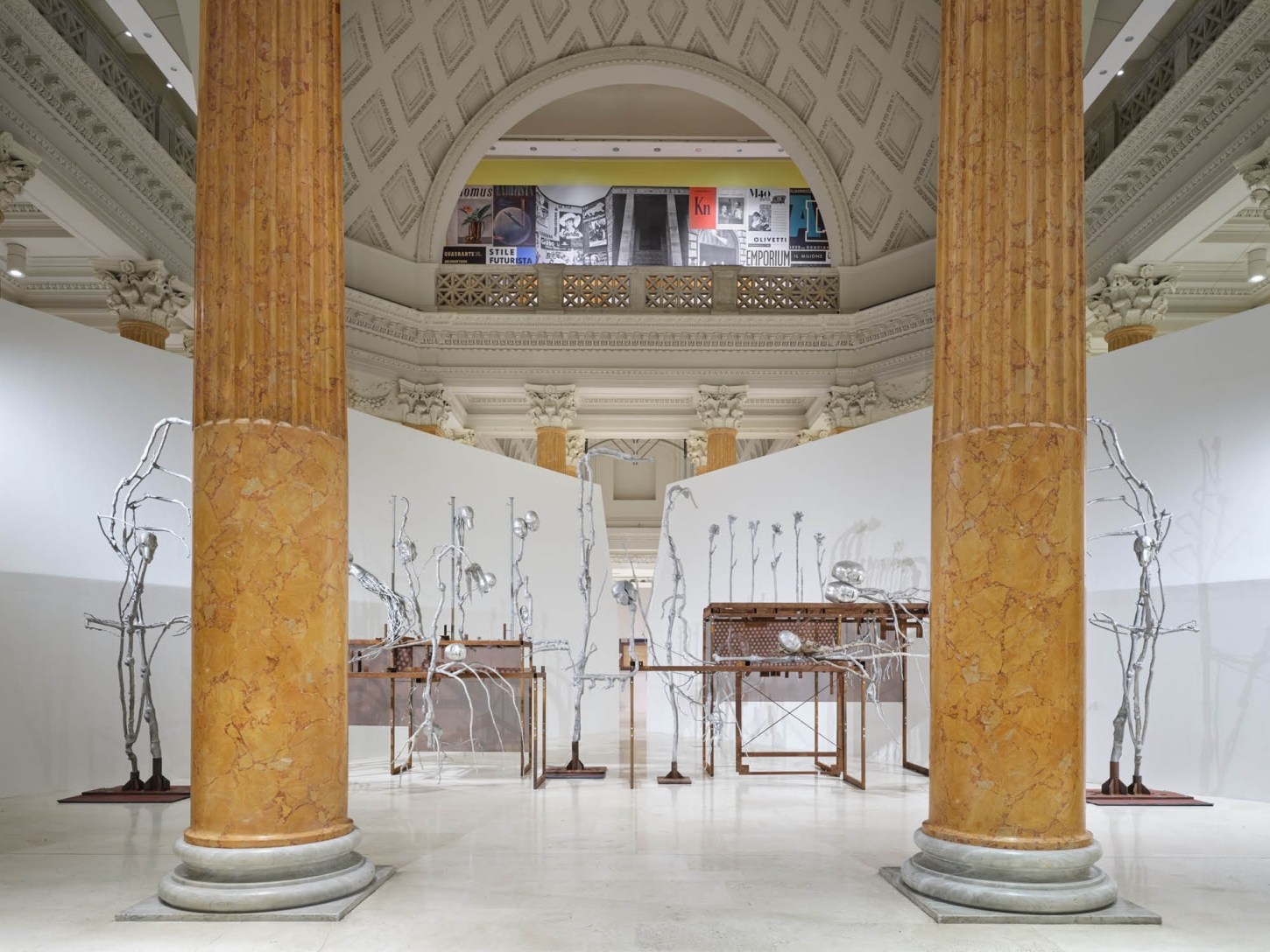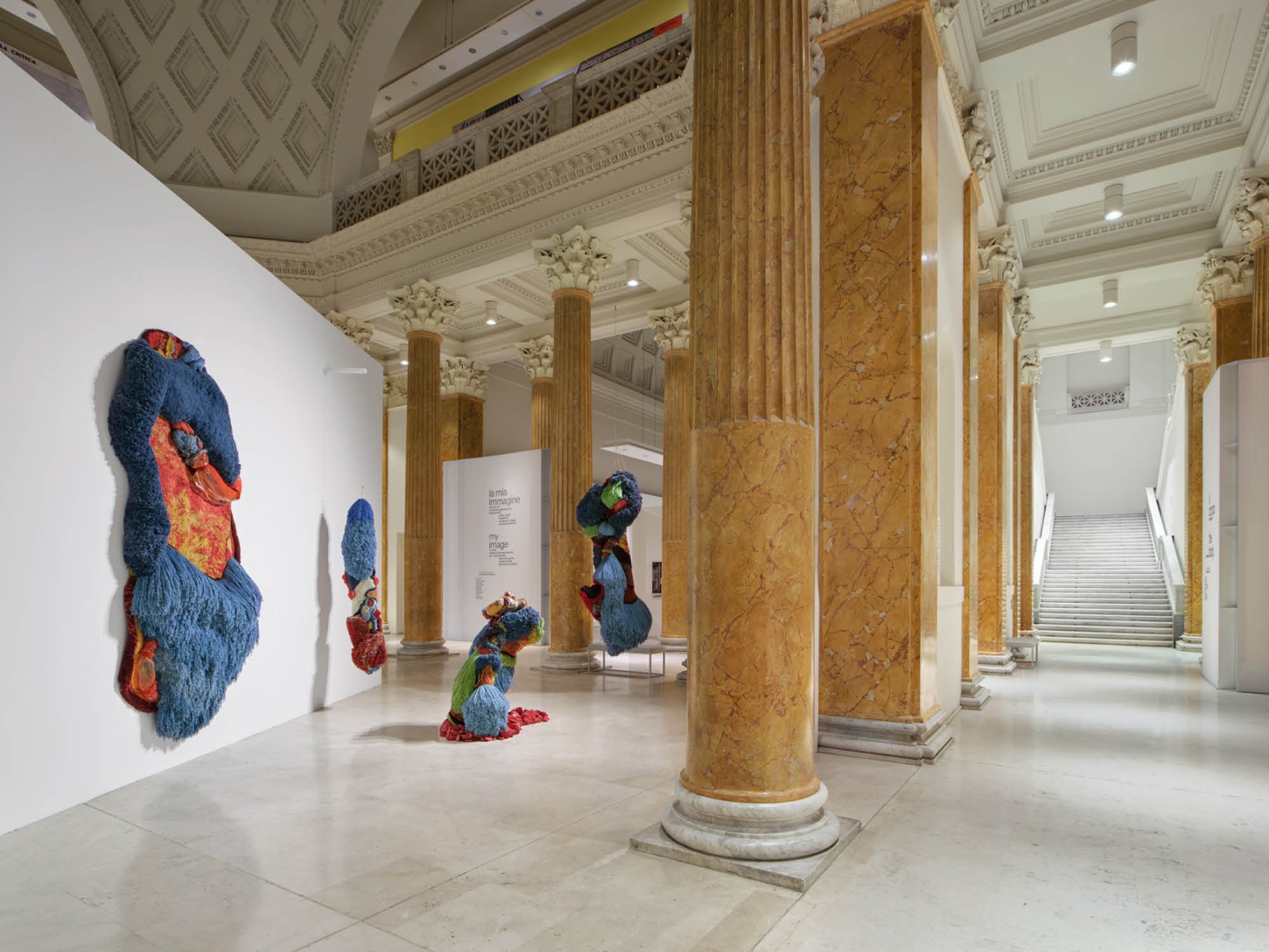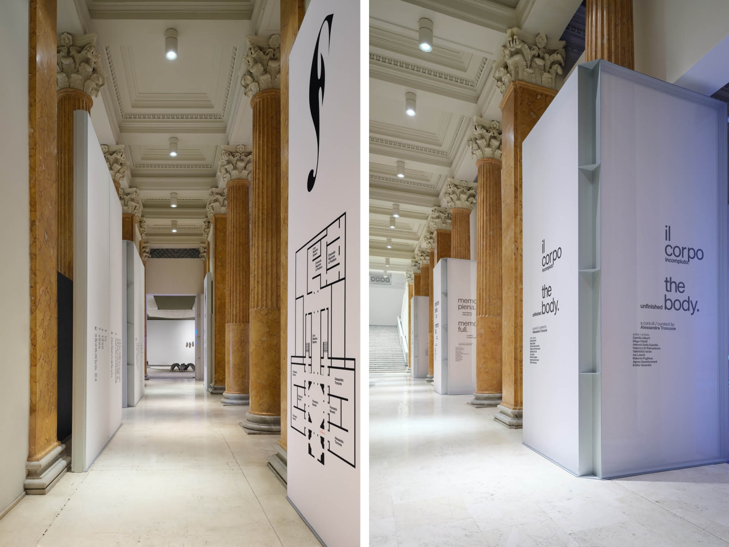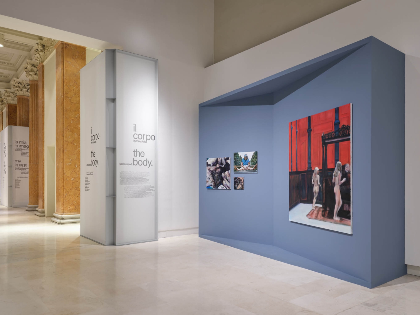 La mostra coinvolge 54 artiste e artisti, con un totale di 187 opere distribuite su oltre 2000 mq; BRH+ traduce questa pluralità in un percorso costituito da dispositivi architettonici senza gerarchie, trasformando gli spazi aulici dello storico Palazzo Esposizioni in un paesaggio narrativo aperto. Il progetto di allestimento è stato concepito come un continuum dinamico che si misura e confronta con la monumentalità neoclassica e la scala gigante del disegno originario di Pio Piacentini per le architetture del Palazzo Esposizioni, introducendo soluzioni che modulano le rigidità distributive originarie, creano relazioni mutue e trasversali tra ambienti solitamente separati e moltiplicano i punti di vista. Gli spazi ospitanti sono messi in relazione diretta, i percorsi di visita resi fluidi, aperti alla possibilità di concedere punti di osservazione spesso molteplici e variabili. Così, ad esempio, l’ambito della grande rotonda centrale del Palazzo nella sezione curata da Francesco Bonami si coniuga con alcune porzioni delle grandi sale vicine, secondo un’idea di progetto che tenta – qui come negli altri casi – di rompere qualsiasi schematicità distributiva, fluidificare le connessioni tra i distinti volumi e organizzare traiettorie di visita alternative tra loro.