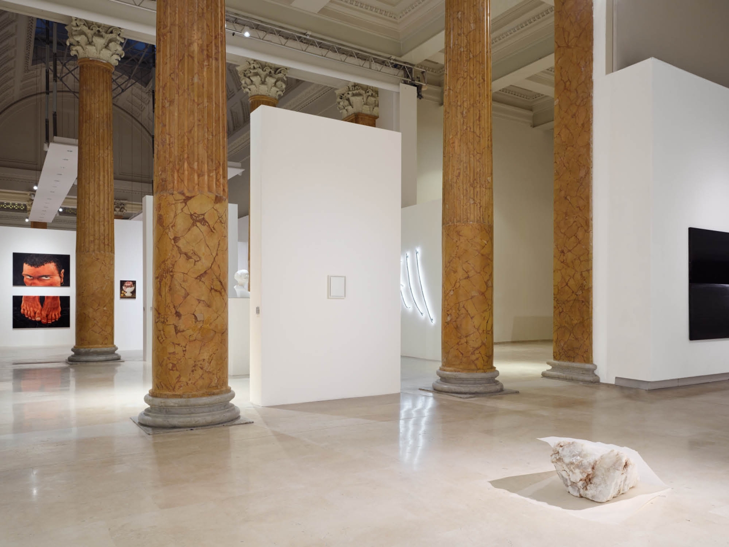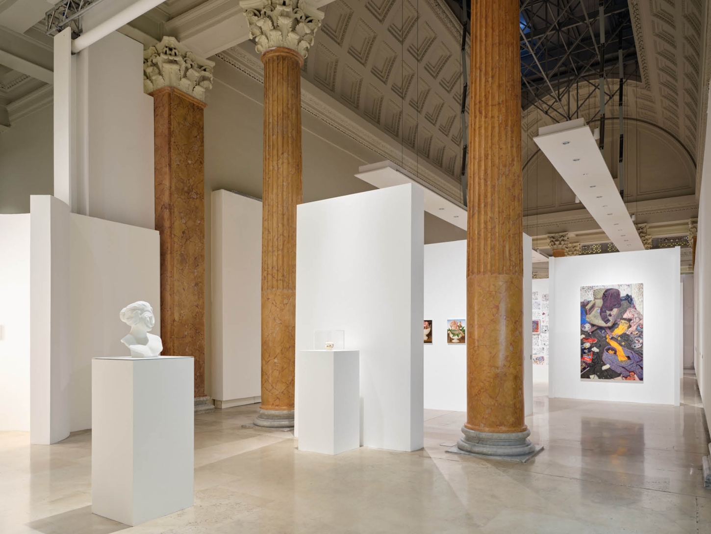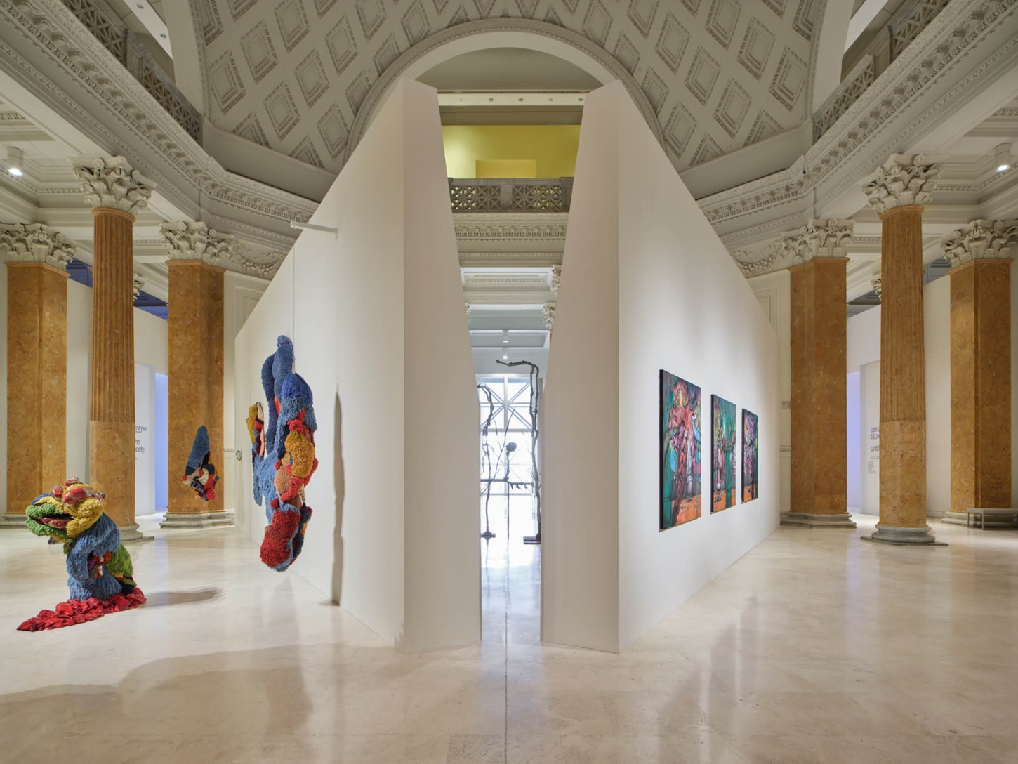La mostra coinvolge 54 artiste e artisti, con un totale di 187 opere distribuite su oltre 2000 mq; BRH+ traduce questa pluralità in un percorso costituito da dispositivi architettonici senza gerarchie, trasformando gli spazi aulici dello storico Palazzo Esposizioni in un paesaggio narrativo aperto. Il progetto di allestimento è stato concepito come un continuum dinamico che si misura e confronta con la monumentalità neoclassica e la scala gigante del disegno originario di Pio Piacentini per le architetture del Palazzo Esposizioni, introducendo soluzioni che modulano le rigidità distributive originarie, creano relazioni mutue e trasversali tra ambienti solitamente separati e moltiplicano i punti di vista. Gli spazi ospitanti sono messi in relazione diretta, i percorsi di visita resi fluidi, aperti alla possibilità di concedere punti di osservazione spesso molteplici e variabili. Così, ad esempio, l’ambito della grande rotonda centrale del Palazzo nella sezione curata da Francesco Bonami si coniuga con alcune porzioni delle grandi sale vicine, secondo un’idea di progetto che tenta – qui come negli altri casi – di rompere qualsiasi schematicità distributiva, fluidificare le connessioni tra i distinti volumi e organizzare traiettorie di visita alternative tra loro.