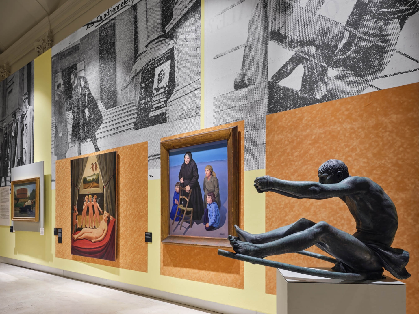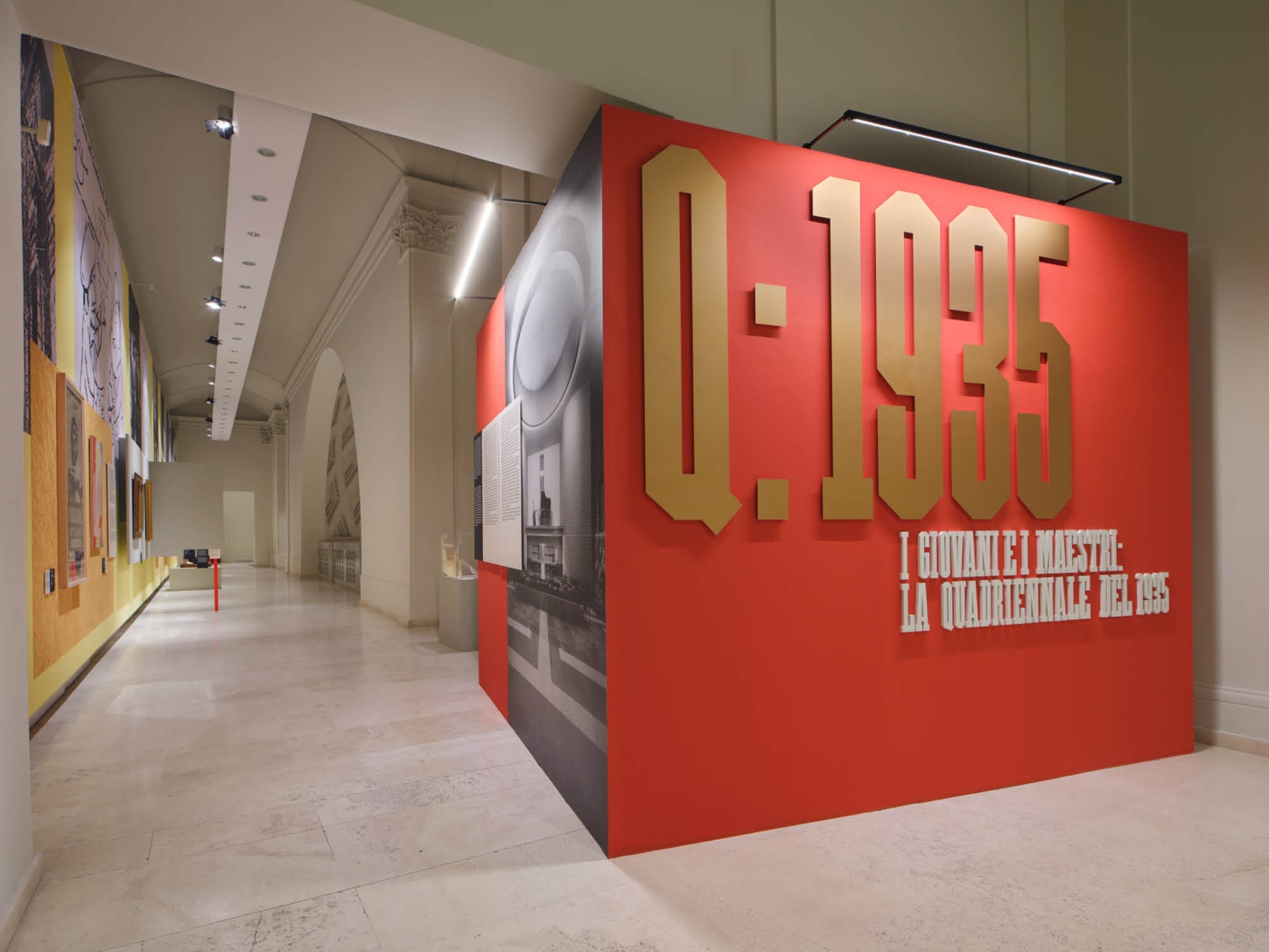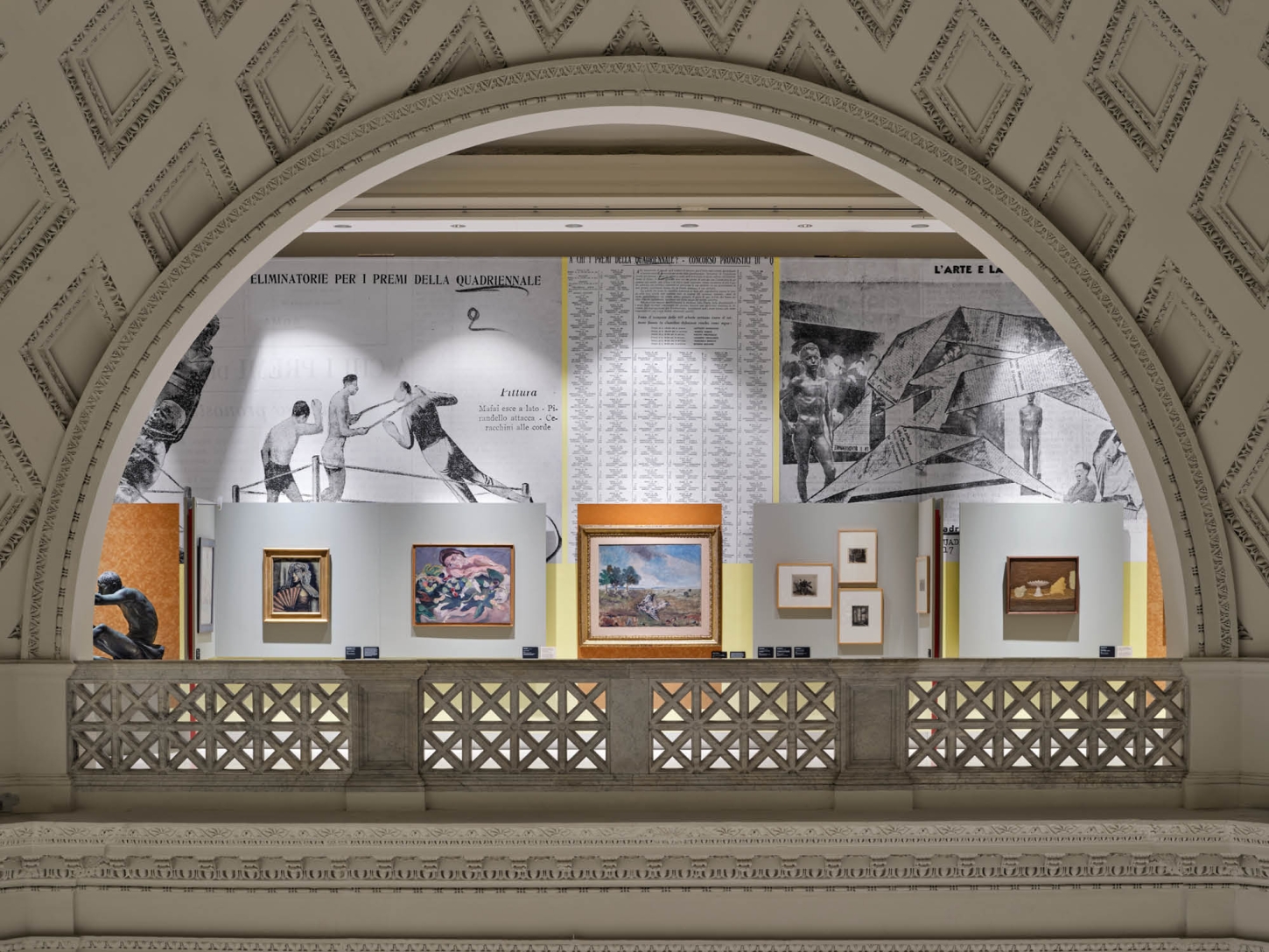 I dipinti e le sculture presenti – tra cui figurano, solo per citarne alcuni, i nomi di autori straordinari come Martini, Marini, De Chirico, Scipione, Sironi, Morandi – congiuntamente con i tanti documenti d’archivio selezionati dall’Archivio Biblioteca della Quadriennale, si susseguono in un percorso dinamico scandito da un fregio fotografico di grande formato che amplifica la dimensione iconografica delle opere e crea un impatto visivo intenso e immediato. Il progetto architettonico di BRH+ e quello grafico, a cura dello Studio Sonnoli, hanno in occasione di questa mostra collettiva un punto di contatto pieno, un’integrazione assoluta, improntata alla ricerca di un segno netto e contemporaneo con cui interpretare la meravigliosa e preziosa visione di un episodio storico tanto ricco di stimoli artistici.