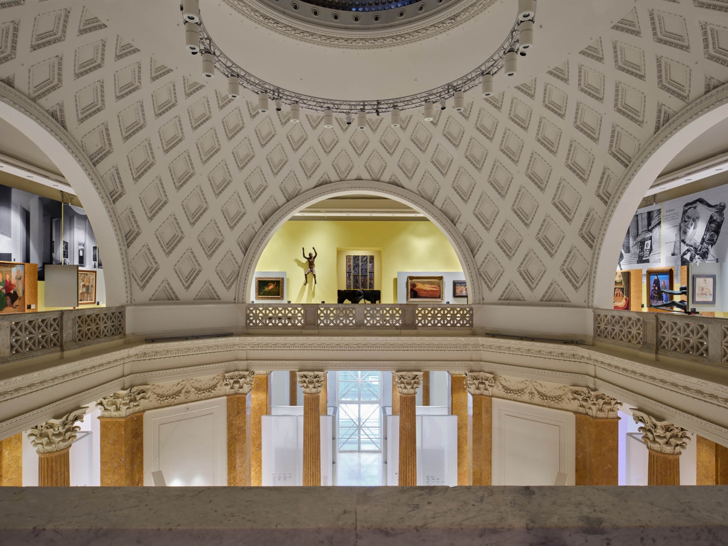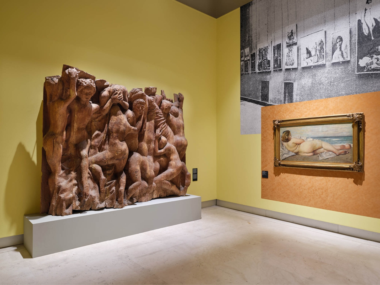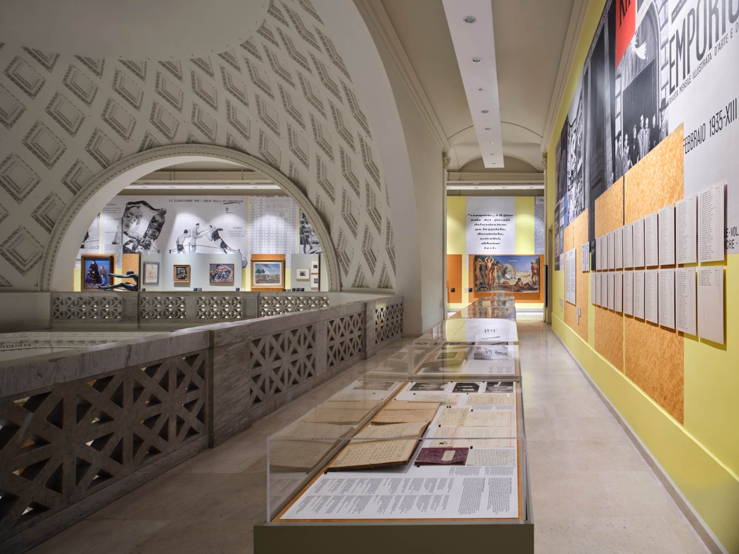 I dipinti e le sculture presenti – tra cui figurano, solo per citarne alcuni, i nomi di autori straordinari come Martini, Marini, De Chirico, Scipione, Sironi, Morandi – congiuntamente con i tanti documenti d’archivio selezionati dall’Archivio Biblioteca della Quadriennale, si susseguono in un percorso dinamico scandito da un fregio fotografico di grande formato che amplifica la dimensione iconografica delle opere e crea un impatto visivo intenso e immediato. Il progetto architettonico di BRH+ e quello grafico, a cura dello Studio Sonnoli, hanno in occasione di questa mostra collettiva un punto di contatto pieno, un’integrazione assoluta, improntata alla ricerca di un segno netto e contemporaneo con cui interpretare la meravigliosa e preziosa visione di un episodio storico tanto ricco di stimoli artistici.