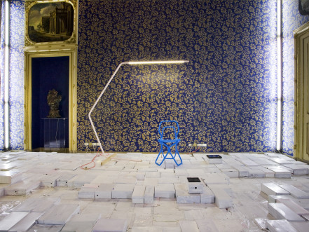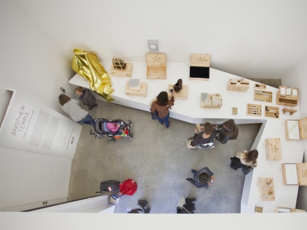 Mischer’Traxler contribuiscono al progetto di allestimento dell’ambiente ideando una sequenza di rami d’albero di medie dimensioni, composti in gruppi, che spiccano dal piano continuo del parquet in corrispondenza dei nodi presenti sulle tavole e configurano una piccola “foresta da camera”; la loro presenza, concretamente organica, rimanda poeticamente al confronto con il mondo naturale e al tema del delicato rapporto dell’uomo con l’ecosistema, che tutti i lavori esposti in mostra, a vario titolo e con sensibilità distinte, affrontano e interpretano.