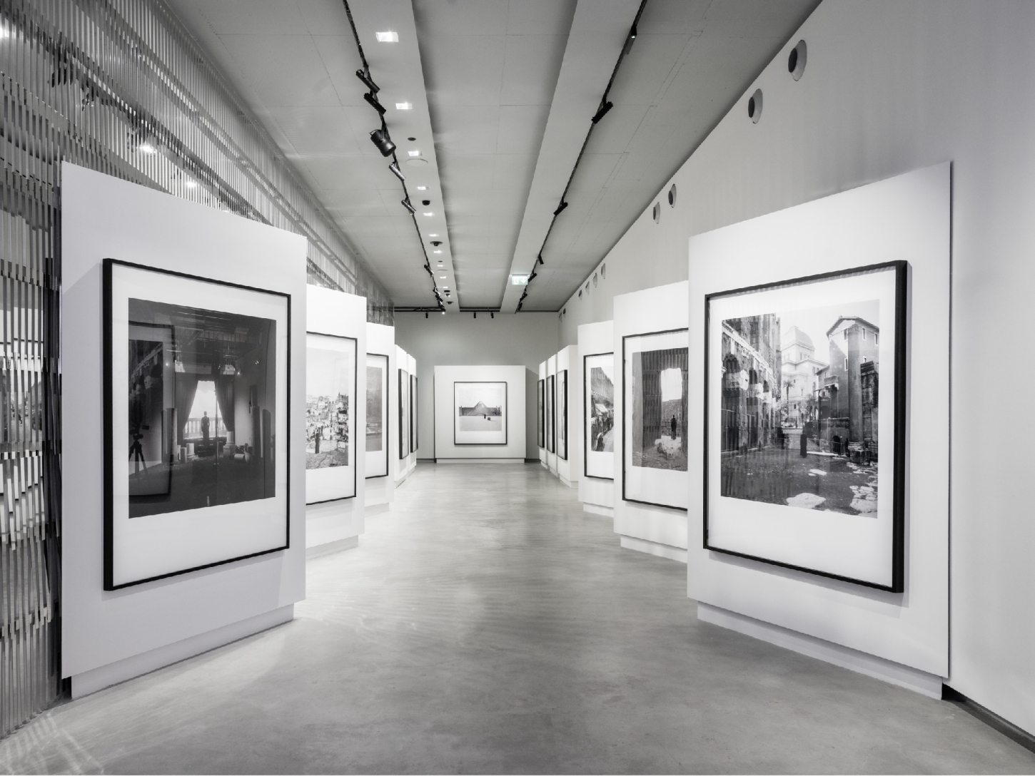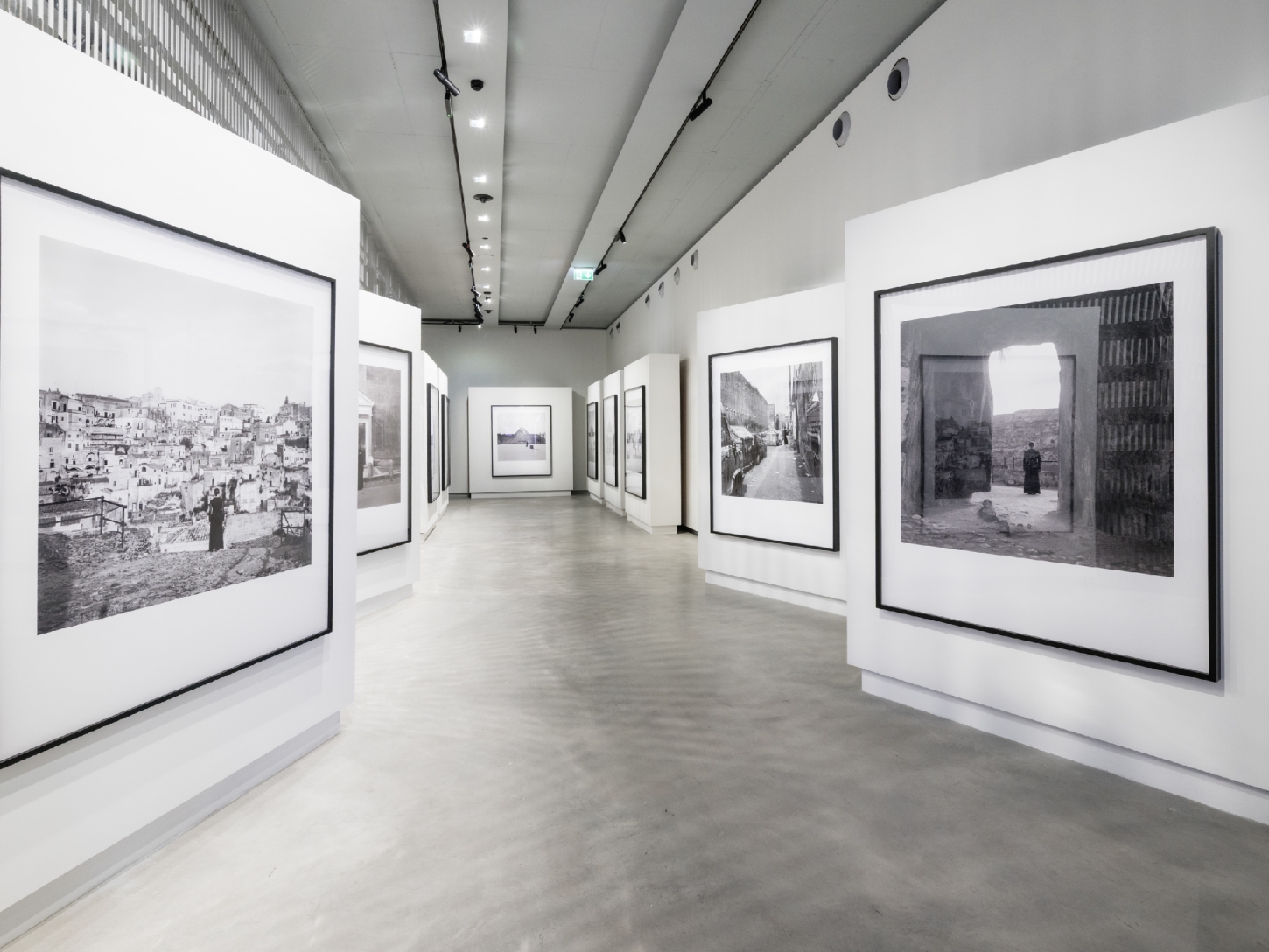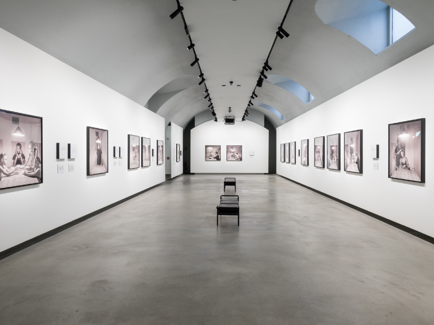 Material and color choices give way to the strength of the images, favoring calm and deep tones that dialogue with the black and white of the photography. The installation is structured through a sequence of environments that alternate density and breath, recollection and openness, according to a measured spatial grammar calibrated to the semantic intensity of the images. Great attention is paid to the design of the light, which writes the space acting as a compositional and dramaturgical element, defining thresholds of attention and suggesting a slowed-down and meditative reading.