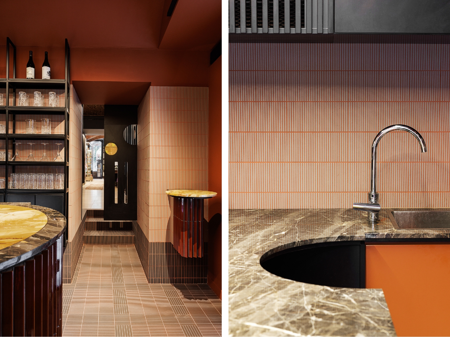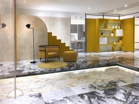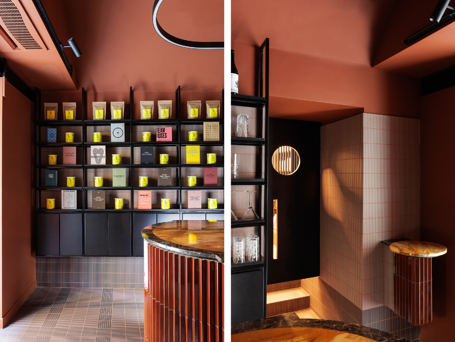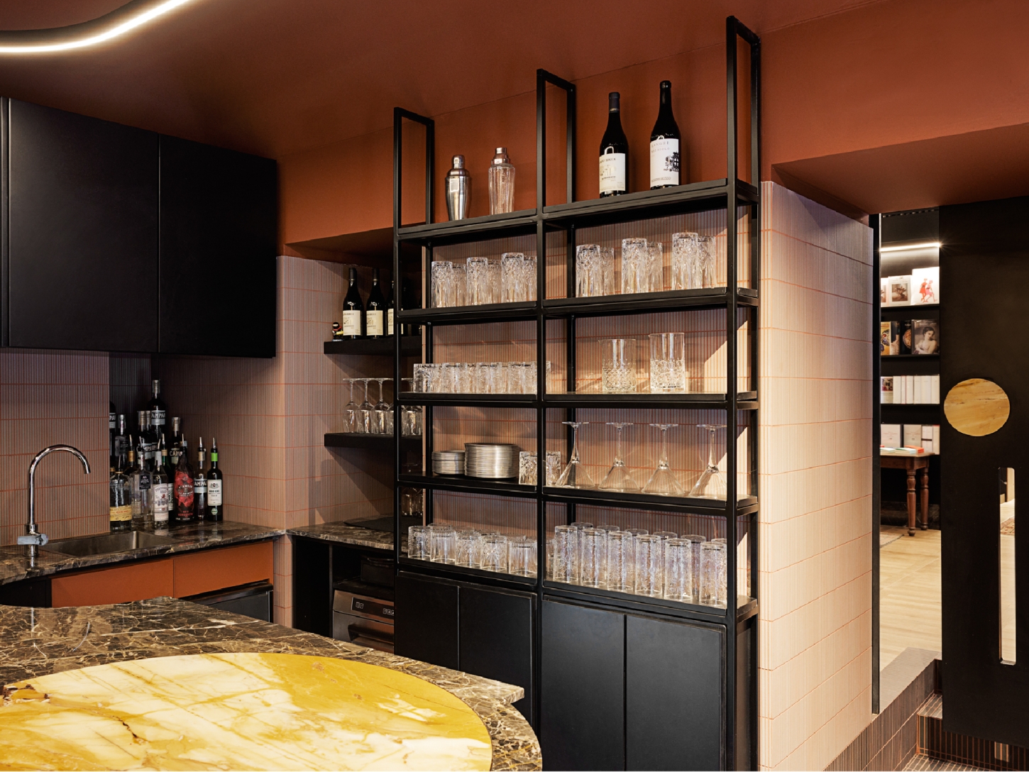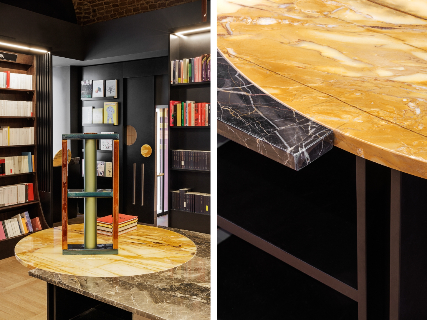 The new furnishings for the interiors and shop windows are conceived in wood, Bellagio marble and Giallo Siena marble and executed by the craftsmen of the historic Sommo Marmi. The pieces are custom-designed to enter into dialogue with the refined collections of ceramic coverings and objects of the Mutina brand. The central counter of the cafeteria is embellished with Ronan & Erwan Bouroullec’s Rombini, while Michael Anastassiades’ Fringe collection was chosen for the walls and floor. The ceiling of the cash desk space is covered with Adagio, a series of ceramic modules designed by Ronan Bouroullec. For the bathrooms of the bookshop the ceramics are also by Mutina, with Fringe by Michael Anastassiades and Mattonelle Margherita by Nathalie Du Pasquier.